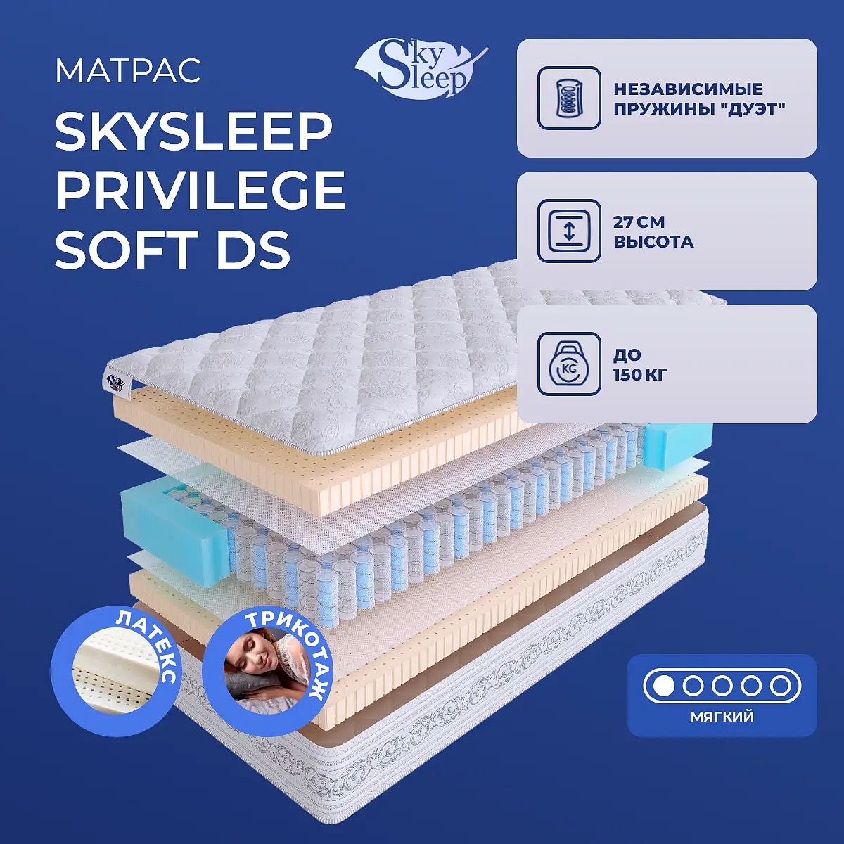 Матрас SkySleep Privilege Soft DS — воплощение мягкости и комфорта для ценителей люксового уровня сна. Элегантное сочетание натурального латекса и независимого пружинного блока DS «Дуэт» обеспечивает деликатную поддержку и расслабление в любой позе. Модель создана для тех, кто предпочитает мягкие ощущения и желает наполнить пространство спальни чувством уюта и статуса. Высота матраса 27 см подчеркивает его выразительный силуэт и дарит ощущение невесомости, а объемный чехол из хлопкового трикотажа с простежкой на шерстипоне придает мягкость и нежность каждому прикосновению. Ключевые особенности