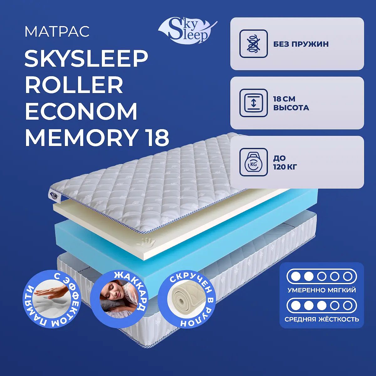 Матрас SkySleep Roller Econom Memory 18 — это беспружинный матрас с разной жесткостью сторон, который обеспечивает комфортный сон и универсальную поддержку. Одна сторона матраса — умеренно мягкая за счет слоя Memory 4 см, другая — средней жесткости благодаря 14 см пенополиуретана. Такой подход позволяет выбрать оптимальное ощущение для сна и легко менять сторону по своим предпочтениям. Чехол выполнен из прочного синтетического жаккарда со стеганым синтепоном (100 г/м2), что делает поверхность приятной на ощупь, аккуратной и долговечной. Матрас выдерживает нагрузку до 120 кг на спальное место и подходит для ежедневного использования. Благодаря скручиванию в рулон Roller Econom Memory 18 удобно транспортировать и легко разместить даже в небольшом помещении. Ключевые особенности