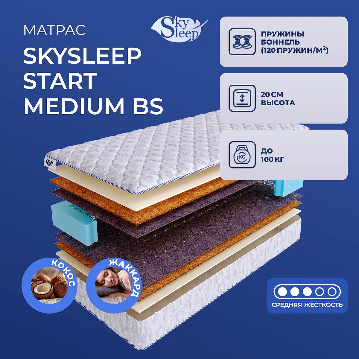 Матрас SkySleep Start Medium BS — это практичное решение для ежедневного сна с комфортной средней жесткостью. Благодаря продуманной многослойной структуре, он обеспечивает сбалансированную поддержку и приятные ощущения для большинства людей среднего телосложения. В основе лежит классический пружинный блок Bonnell с плотностью 120 пружин на м2, который равномерно распределяет нагрузку и сохраняет упругость поверхности. С обеих сторон использованы слои ППУ (пенополиуретана) и бикокоса — сочетание этих материалов придаёт умеренную жесткость, а также долговечность и хорошую вентиляцию. Чехол из хлопкового жаккарда простёган на синтепоне (100 г), что делает поверхность мягкой и приятной для кожи. Ключевые особенности