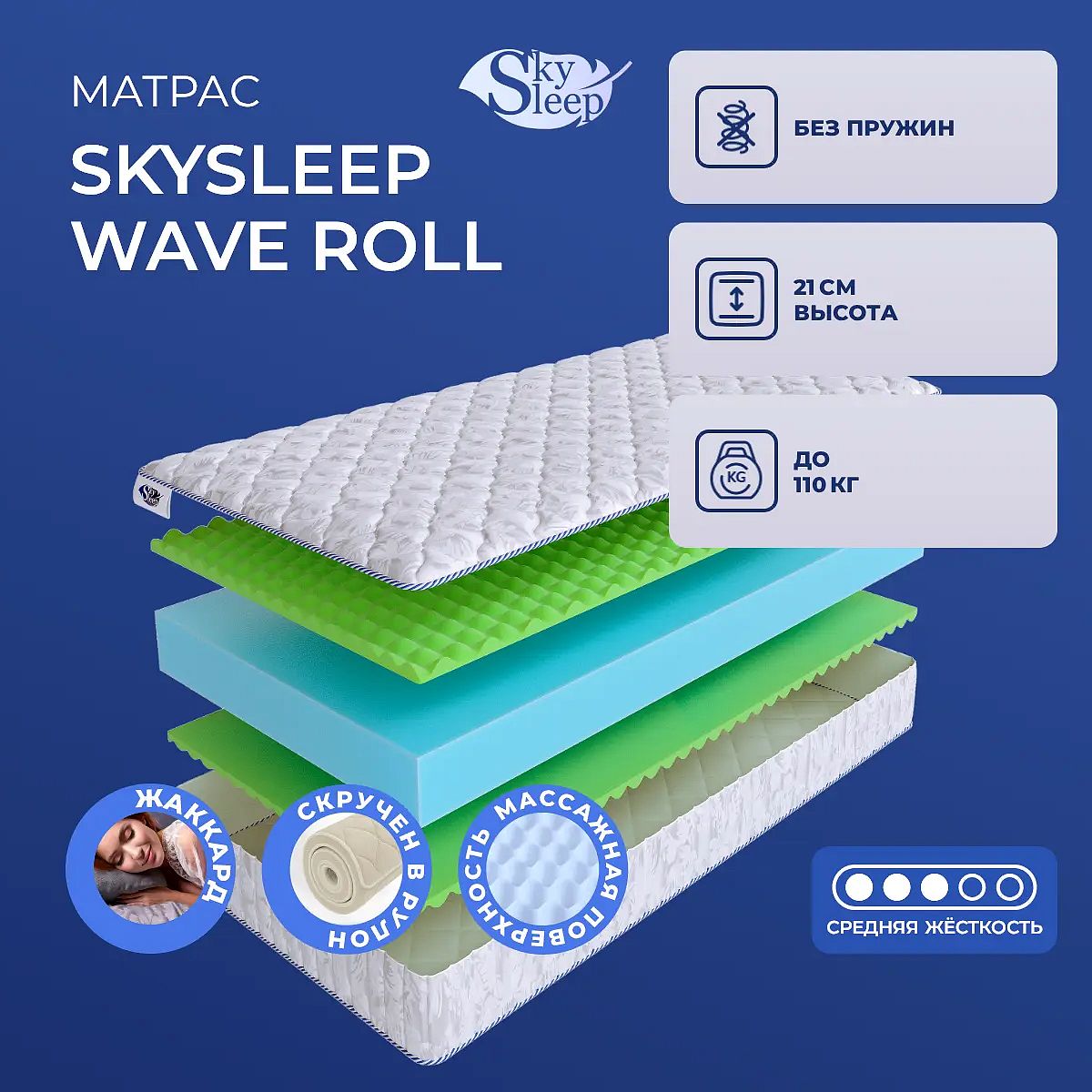 Матрас SkySleep Wave Roll — это современный беспружинный матрас средней жесткости, созданный для комфортного сна и ежедневного отдыха. Матрас сочетает в себе надёжную поддержку и мягкие ощущения благодаря продуманной структуре слоёв. Высота 21 см обеспечивает удобство посадки и достаточную упругость. В конструкции используется массажный ППУ ErgoFoam толщиной 3 см с каждой стороны, который мягко подстраивается под контуры тела и способствует расслаблению мышц. Центральный слой из ППУ высотой 14 см поддерживает позвоночник и сохраняет форму матраса даже при длительном использовании. Чехол выполнен из хлопкового жаккарда, простёганного на синтепоне, что делает поверхность приятной на ощупь и безопасной для кожи. Матрас поставляется скрученным в рулон — это удобно для транспортировки и позволяет легко занести его в квартиру. Ключевые особенности