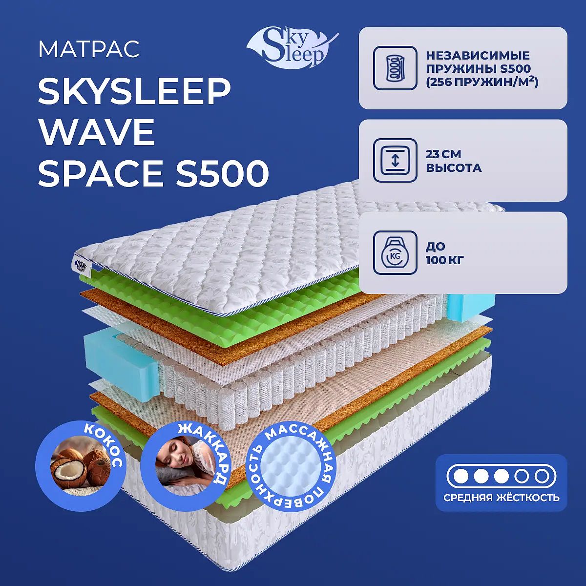 Советы по уходуДля продления срока службы матраса рекомендуется использовать защитный наматрасник (в комплект не входит). О производителеSkySleep — бренд, предлагающий современные матрасы с акцентом на комфорт, долговечность и качество материалов. Модель Wave Space S500 производится в России.