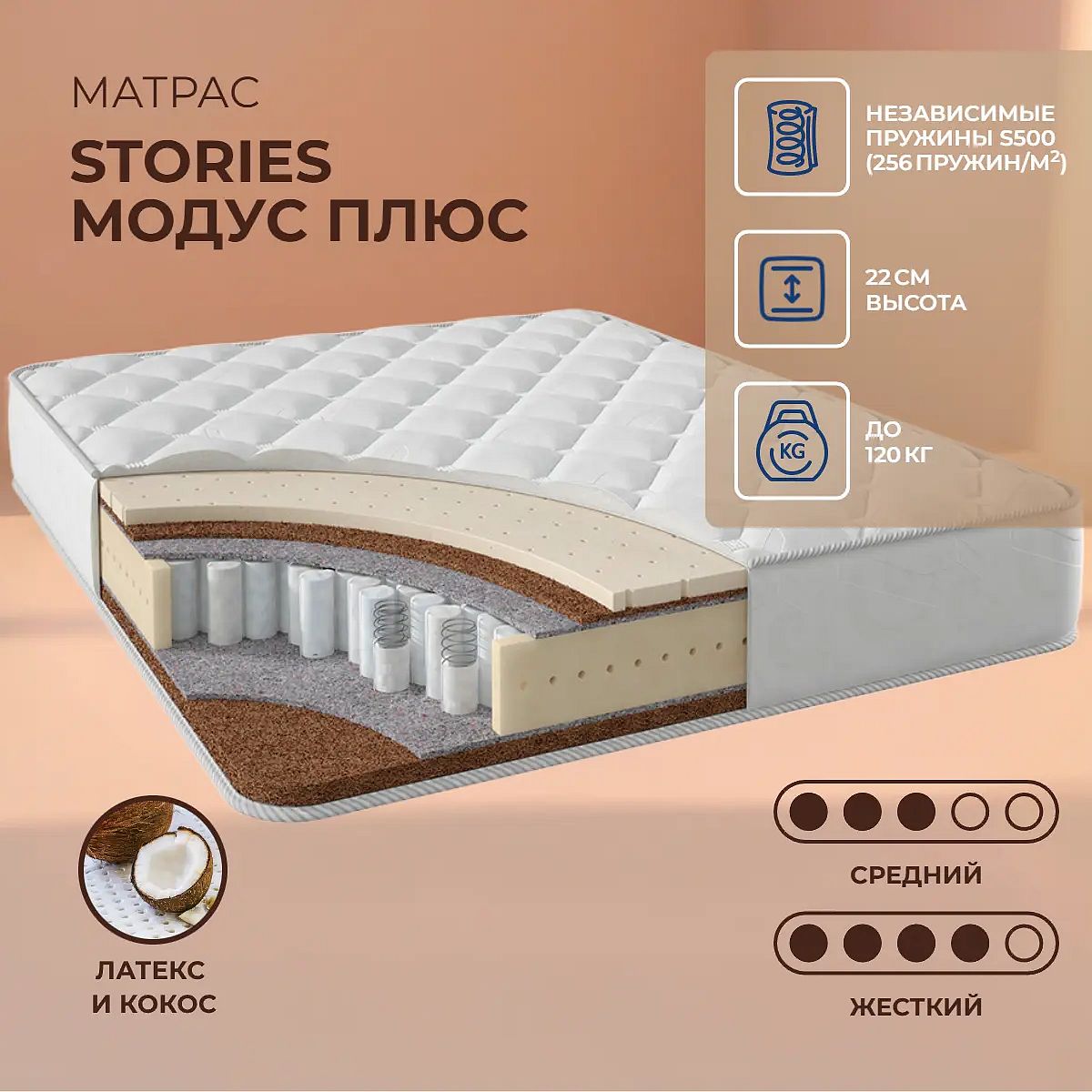 Матрас Stories Модус Плюс — это комфортное решение для сна с универсальной двойной жёсткостью. Одна сторона матраса средней жёсткости с натуральным латексом, обеспечивающим мягкую упругость, другая — более жёсткая за счёт слоя кокосовой койры. Такой подход позволяет выбрать оптимальную поддержку для сна и менять ощущения по своему желанию. Блок независимых пружин TFK (256 пружин на м2) отвечает за равномерное распределение веса и точечную поддержку тела. Матрас выдерживает нагрузку до 120 кг на спальное место, а высота 22 см позволяет использовать его с большинством кроватей стандартной высоты. Чехол выполнен из прочного хлопкового жаккарда со стёжкой на холлконе, что делает поверхность приятной на ощупь и способствует сохранению формы матраса. Ключевые особенности