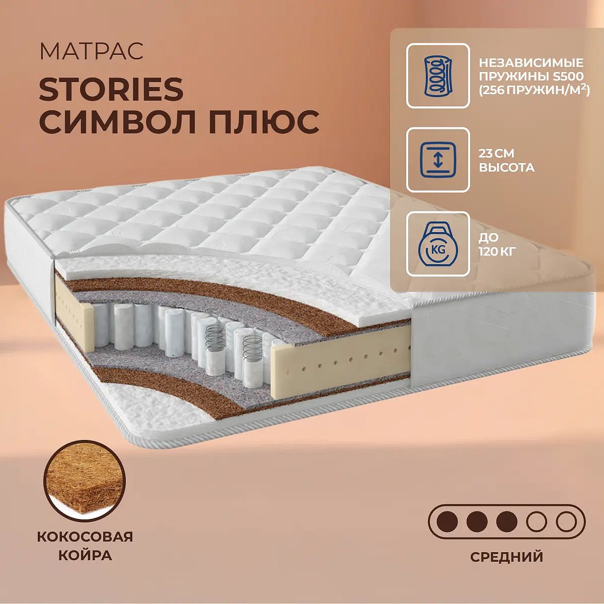 Матрас Stories Символ Плюс – это качественный пружинный матрас средней жесткости из коллекции Классик, рассчитанный на ежедневный комфорт и поддержку. Благодаря симметричному строению и одинаковым сторонам, матрас обеспечивает сбалансированное ощущение упругости и мягкости, подходя для большинства пользователей с разным весом и телосложением. Основу матраса составляет блок независимых пружин TFK с плотностью 256 пружин на м2. Каждая пружина работает автономно, что способствует точечной поддержке тела и помогает сохранять правильное положение позвоночника во время сна. Слои холлофайбера (по 3 см с каждой стороны) придают мягкость и дополнительный комфорт, а прослойки кокосовой койры (1 см) добавляют упругость и поддерживают оптимальный баланс между жёсткостью и эластичностью. Термовойлок обеспечивает равномерное распределение нагрузки по всей поверхности. Чехол выполнен из прочного хлопкового жаккарда, простёганного холлконом (200 г), что делает поверхность матраса приятной на ощупь и долговечной. Высота матраса – 23 см, максимальная нагрузка на одно спальное место – до 120 кг. Ключевые особенности