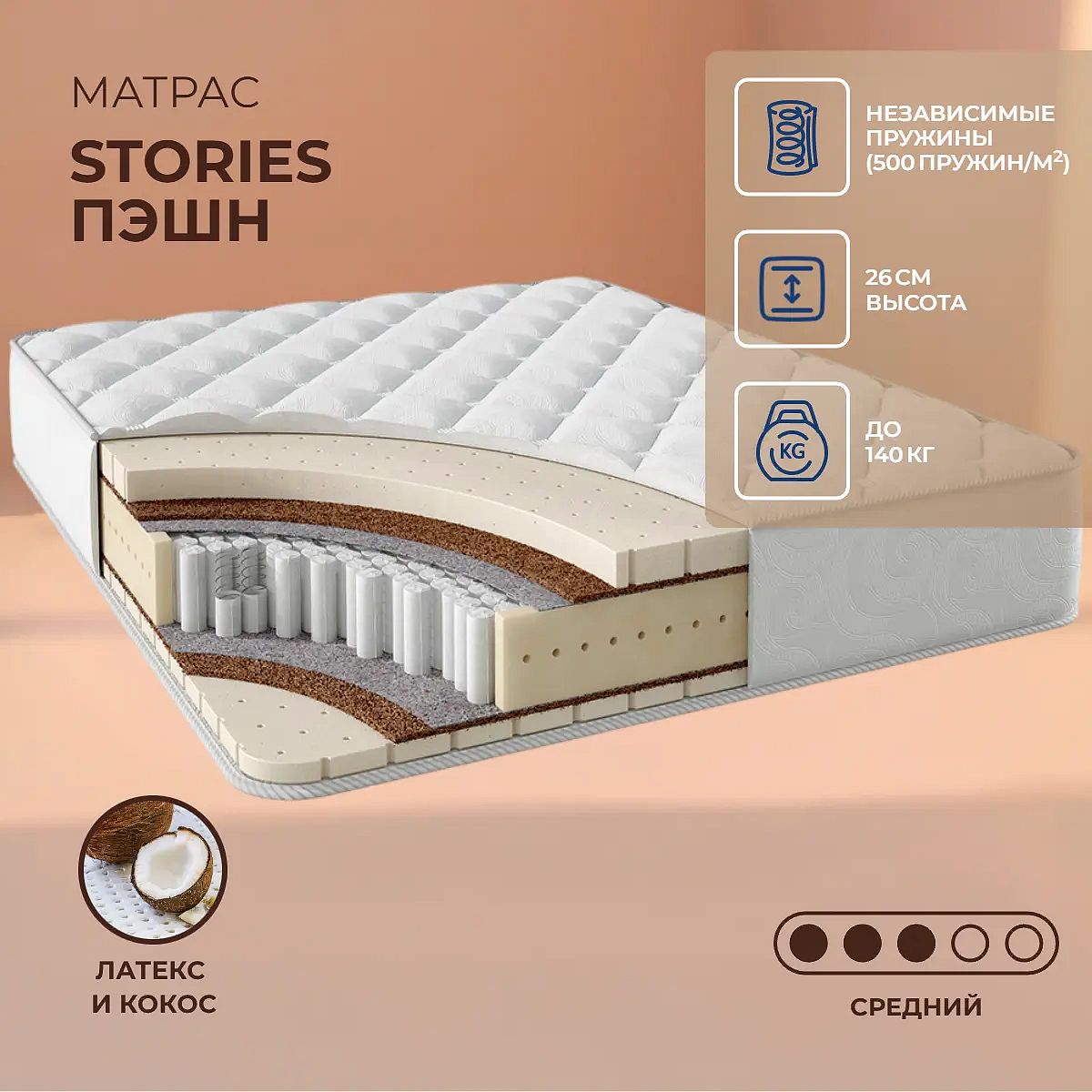 Матрас Stories Пэшн из коллекции Премиум — это сочетание премиальных материалов и продуманной конструкции для комфортного сна. Средняя жесткость на обеих сторонах обеспечивает сбалансированную поддержку и подходит большинству людей, предпочитающих умеренно упругие ощущения. Высота 26 см создаёт ощущение основательности, а максимальная нагрузка до 140 кг на спальное место говорит о прочности и долговечности. В основе — блок независимых пружин S1000 с плотностью 500 пружин на м2, который обеспечивает точечную поддержку и снижает давление на позвоночник. Слой натурального латекса толщиной 3 см с одной стороны и 6 см с другой идеально подстраивается под изгибы тела, создавая упругую, но мягкую поверхность. Прослойки кокосовой койры (по 1 см с каждой стороны) придают конструкции дополнительную жёсткость и устойчивость к деформациям, а термовойлок повышает износостойкость матраса. Ключевые особенности
