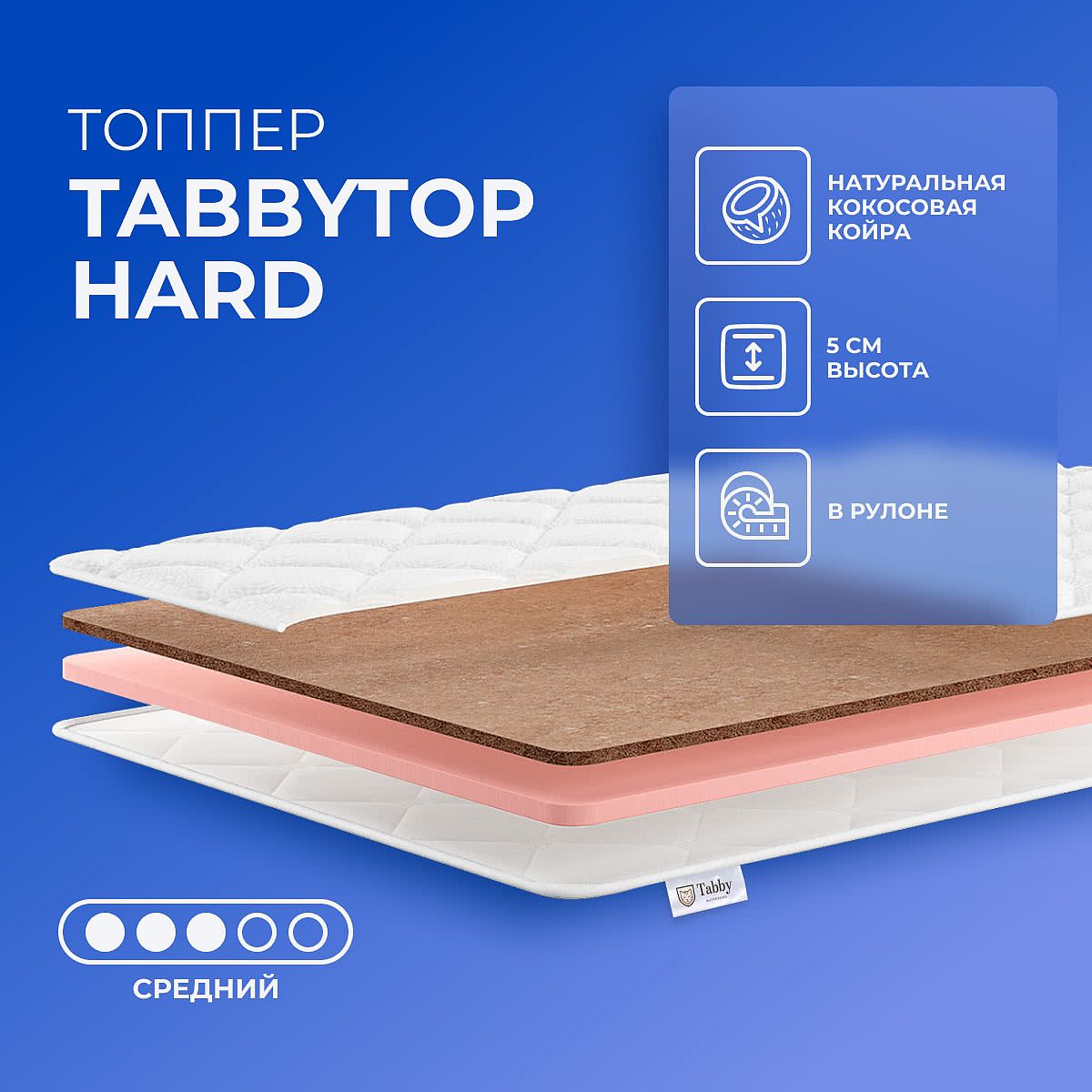 Топпер TabbyTop Hard — это дополнительный матрас для создания ровной, комфортной и поддерживающей поверхности сна. Благодаря сочетанию кокосовой койры и пенополиуретана, топпер подходит для выравнивания спального места на кровати или диване, а также для смягчения или повышения жёсткости старого матраса. Высота изделия составляет 5 см, что обеспечивает ощутимую поддержку и комфорт в ежедневном использовании. Две стороны топпера имеют разную жёсткость, что делает его универсальным выбором для большинства пользователей. Кокосовая койра придаёт изделию упругость и прочность, а слой пенополиуретана способствует мягкости и поддержке тела во время сна. Чехол выполнен из жаккарда — прочной и приятной на ощупь ткани, хорошо пропускающей воздух. Благодаря резинкам по углам топпер надежно фиксируется на основном матрасе и не скользит. Свойства