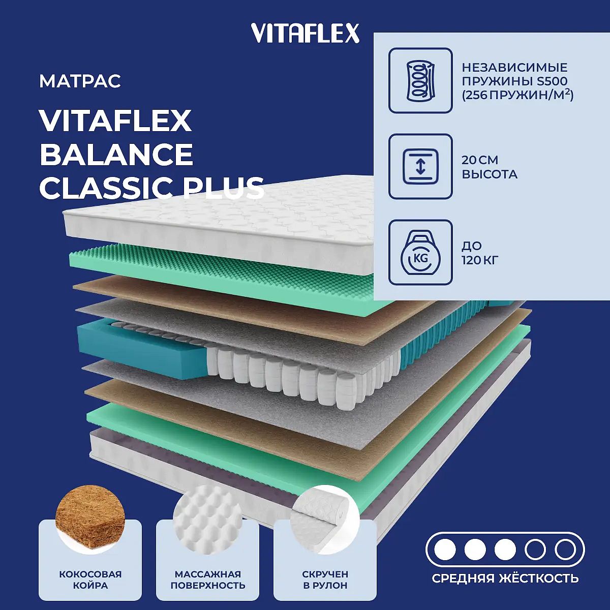 О производителеVitaflex — российский производитель, предлагающий практичные и современные решения для комфортного сна. Модель Balance Classic plus входит в коллекцию «Топ-30» и сочетает в себе проверенные материалы и сбалансированный уровень поддержки.